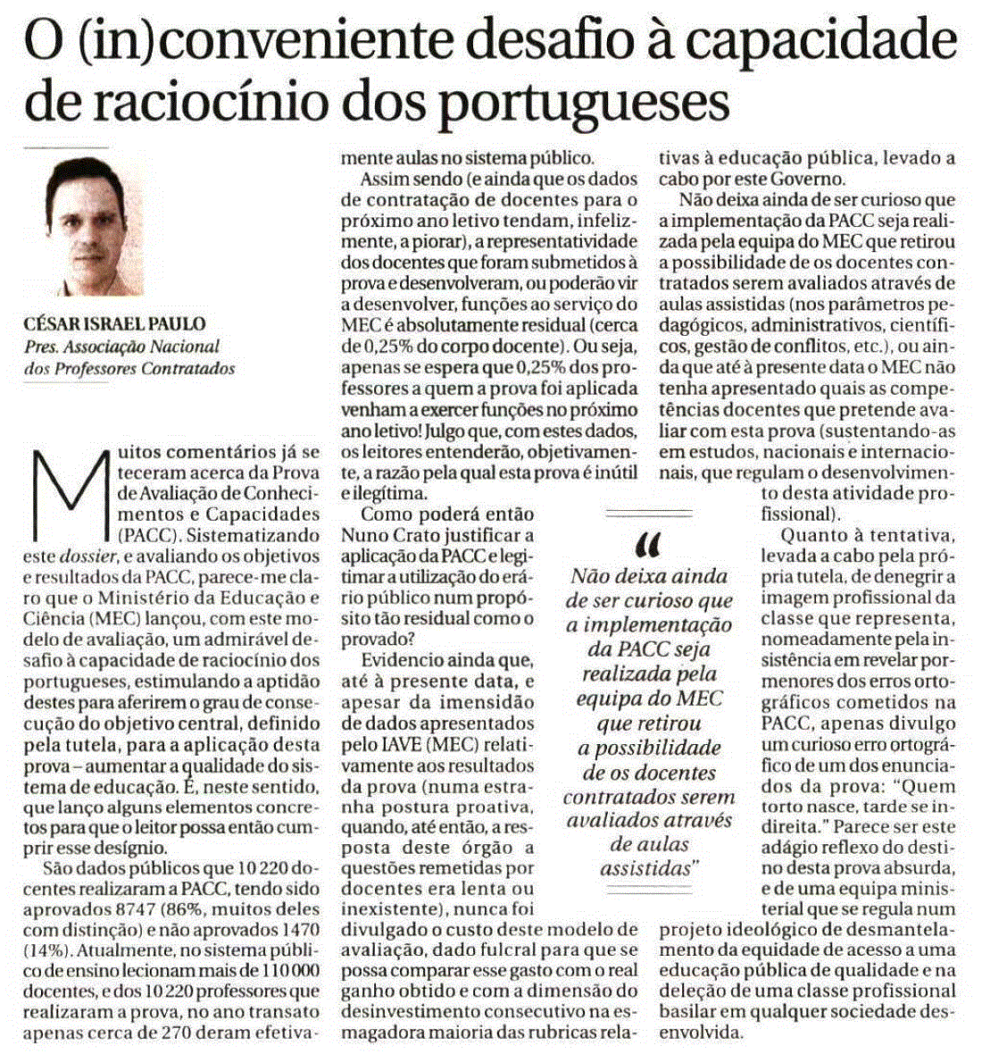 Intervenção do Presidente da ANVPC, César Israel PAulo, acerca de uma das principais “atrocidades” cometidas pelo MEC nos últimos anos, e uma possível interpretação para o problema noticiado pelo DN.